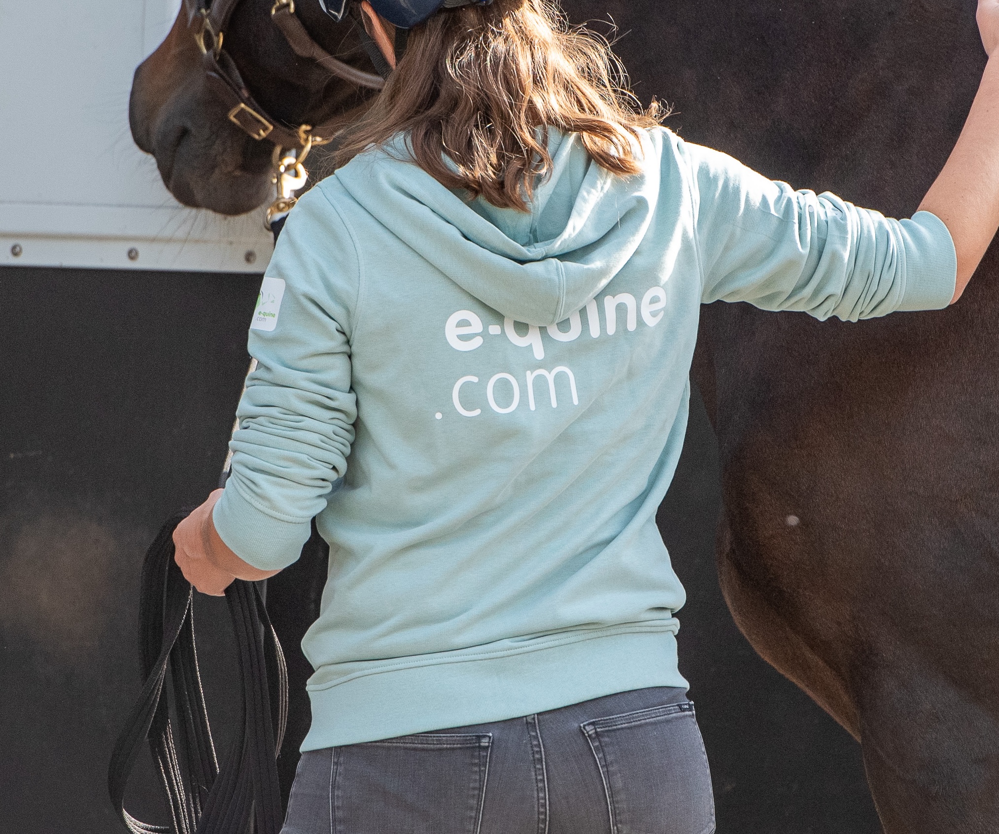 Bedrukking: op de rug groot e-quine.com, vierkant logo op ene mouw, tekst e-quine.com op andere mouw.